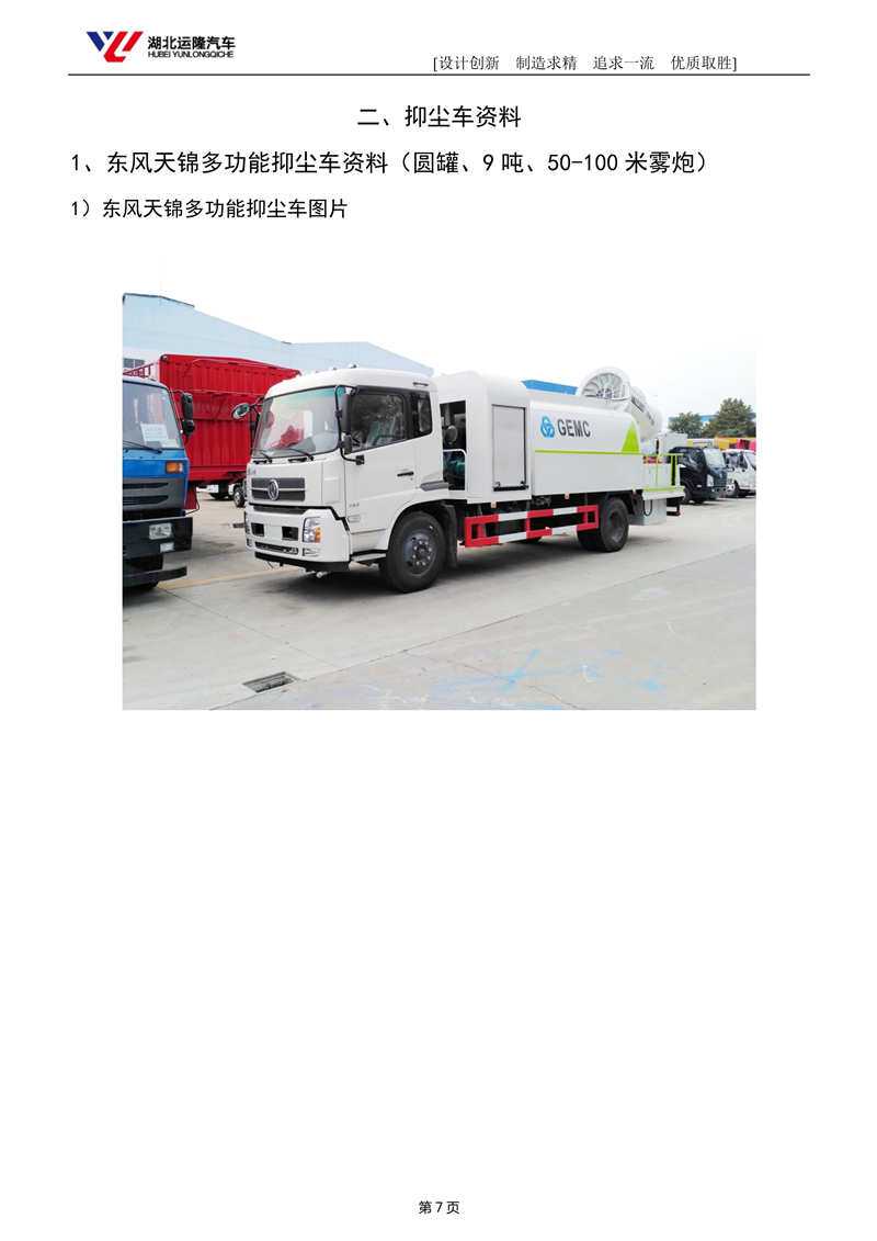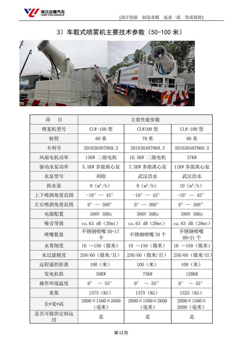 上裝配置:罐體容積為 10-12 立方多功能抑塵灑水車,選配風送式霧炮機組射程50米、60米、80米,罐體鋼板為4mm碳鋼Q235材質,罐內隔板具有防波作用,以減輕汽車行駛時罐體液體沖擊,罐體及整車外形尺寸按照公告。帶大功率專用灑水泵,泵可自吸自排,整車前沖、后灑、側噴、帶65消防接口,后平臺配CLW-50、CLW-60、CLW-80型風送式霧炮機組;罐體前封頭配大功率柴油發電機組;遠程遙控系統控制;霧炮自動旋轉角度0-360°。后平臺帶綠化灑水炮,灑水炮可全方位旋轉,可連續調成直沖狀、大雨、小雨、毛毛雨;前封頭帶水位計,后平臺主管路帶1寸澆花接口,后爬梯。帶兩根輸水管及陰陽端。罐體顏色:白/蘭,罐體兩側噴“多功能抑塵車”字樣,貼反光標示。