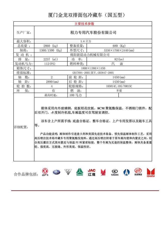 廈門金龍雙排面包冷藏車